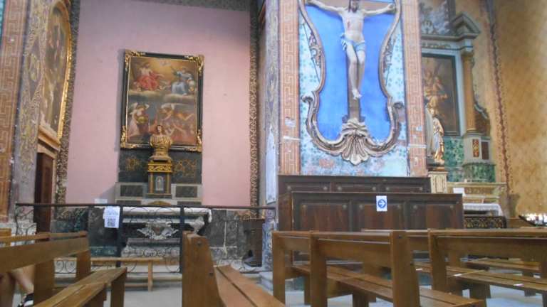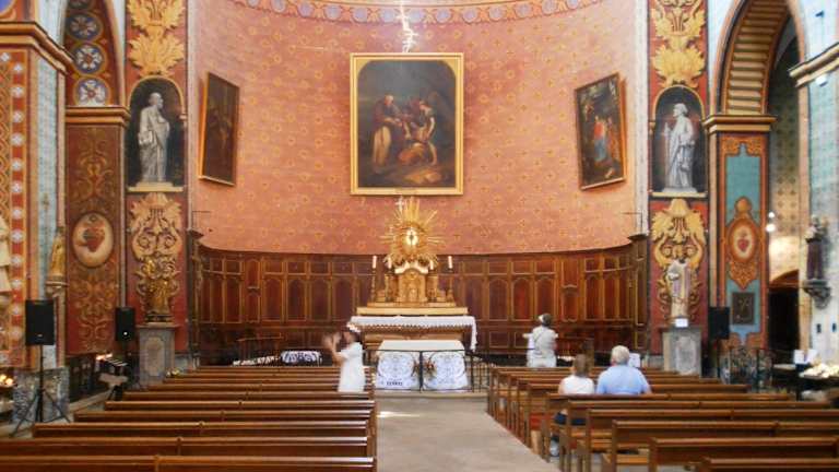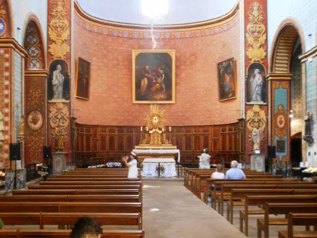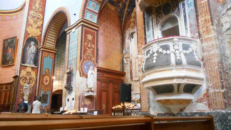 Saint Firmin ist der Schutzpatron des Dorfes, und ihm ist die im 18. Jahrhundert erbaute Kirche geweiht. Das imposante Kirchengebäude, für das damals etwa 20 Häuser weichen mussten, wirkt wie eine Festung auf dem Felsen und verleiht dem Dorf sein burgartiges Aussehen. Durch die Enge der Gassen um die Kirche und den nur geringen Abstand zur übrigen Bebauung wirkt die Kirche noch mächtiger. Innen sie sehr farbenfroh und mit wunderschönen Dekorationen ausgestattet.