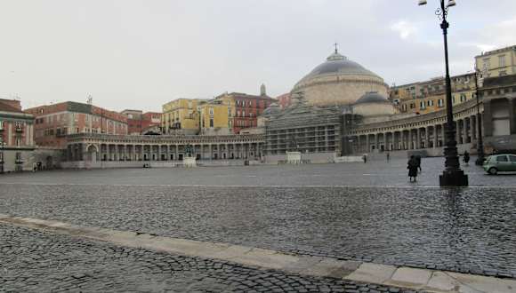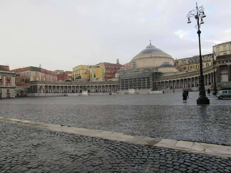 San Francesco di Paola Kirche 1817-46, geplant vom König von Neapel Joachim Murat, dem Schwager von Napoleon. Nach dessen Absetzung neue Planung durch den Burbonen König Ferdinand benannte diese Kirche nach dem Franz von Paola der hier im 16. Jahrhundert hier in einem Kloster einge Jahre lebte. Der Bau erinnert an das Panetheon in Rom. Bemerkenswert sind die halbmondförmigen Arkaden links und rechts. Auf der gegenüberliegenden Seite ist der Palazzo Reale, dazwischen Piazza del Plebiscito.
