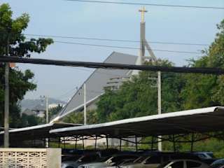 Die Kirche mit ihrer interessanten modernen Architektur liegt etwas zurückgesetzt von der Hauptstraße gegenüber vom Hotel „Marriott Resort & Spa“ an der Phetkasem Road.