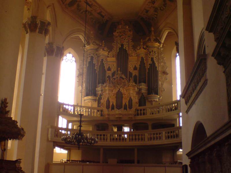 Die interessanstesten Ausstattungsstücke dieser Kirche sind der barocke Hochaltar (am Eingang ist ein Bogen erhältlich auf dem er erklärt wird) und die imposante Orgel, die u.a. von J. S. Bach abgenommen wurde. Auf der Orgel wird mittags gespielt, wir konnten die Orgel auch später erklingen hören, Studenten spielten auf ihr, u. a. Stücke von Bach. Erstaunlich, wie laut die Orgel in der Kirche zu hören war! Für mich ein besonderes Erlebnis! Der Eintritt in die Kirche war frei. Es bestand die Möglichkeit, für 1,50 € den Turm zu besteigen, gut 200 Stufen. Wir haben das nicht gemacht, aber die Aussicht dürfte großartig sein. Der Marktplatz mit dem Rathaus ist ganz in der Nähe, und der Dom ist auch nicht weit weg.