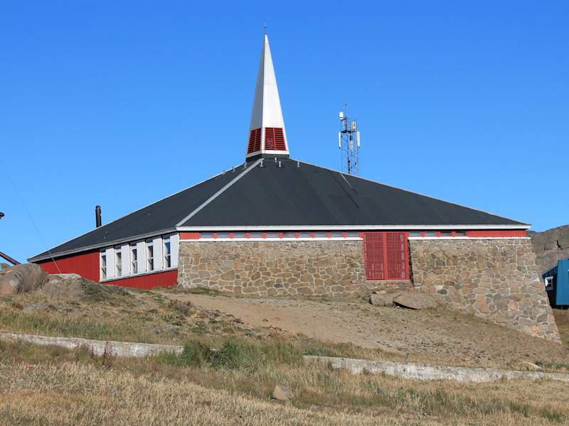 Die (neue) Kirche von Tasiilaq wurde 1985 errichtet. Ihr Inneres (Zeichnungen und Dekorationen) wurde vom grönländischen Architekten Aka Høegh konzipiert. In der alten Kirche befindet sich heutzutage das Ammassalik Museum. Die Kirche von Tasiilaq ist christlichen Glaubens, das wurde uns gesagt. Ob es sich jedoch um eine protestantische oder eine katholische Kirche handelt konnten wir nicht herausfinden. Auf der Spitze des Kirchturms war weder ein protestantischer Hahn noch das typische katholische Kreuz zu sehen. Mit dem Pfarrer konntenn wir uns nicht unterhalten, denn es spricht nur grönländisch. Spannend ist die Kirche auf jeden Fall aus architektonischer Betrachtungsweise. Rund um das Gotteshaus wurde eine Art Wall errichtet, so dass sie selbst im Winter ein wenig gegen die Schneestürme geschützt ist. Die Öffnungszeiten der Kirche sind von 10.00-12.00 und von 14.00-16.00 Uhr (dienstags und samstags geschlossen). Sonntags findet der Gottesdienst von 10.00-11.00 statt und dieser ist stets gut besucht. Touristen sind herzlich willkommen.