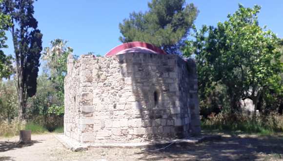 Die Kirche stammt aus dem 15. Jahrhundert, als die Kreuzritter sich in Kos niedergelassen hatten. Sie ist dem Heiligen Johannes dem Vorläufer, dem Schutzpatron der Johanniter gewidmet. Die Kirche befand sich ursprünglich am Rande der ummauerten Stadt. In den 1940er Jahren wurde sie Stein für Stein von den Fundamenten abgebaut und an ihrem jetzigen Standort wieder aufgebaut.