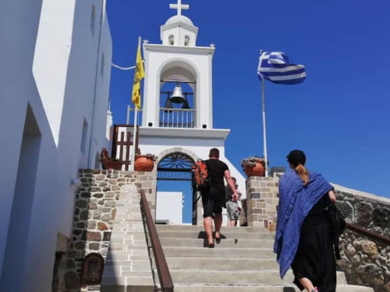 Das Kloster liegt weit oben am Hang (gut ausgeschildert), aber man sollte sich hinauf besser ein Taxi nehmen, denn der Weg liegt in voller Sonne. Von oben hat man einen tollen Blick auf Pythagorion mit Hafen und Umland. Die Grotte mit der kleinen Kapelle ist sehr sehenswert und schön kühl ;o) Eintritt frei. Auf dem selben Weg liegen noch das Amphitheater und der Eupalinos-Tunnel, die man sich auch ansehen sollte.