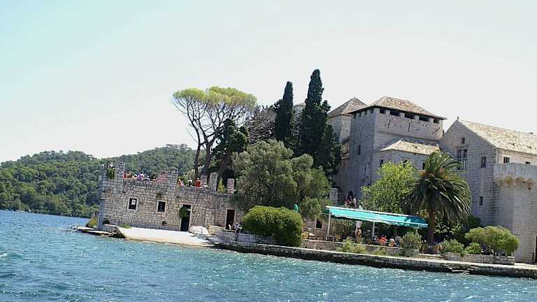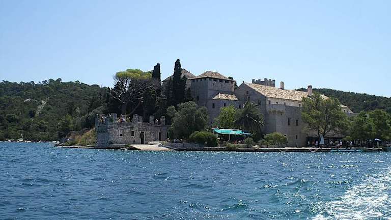 Im Nationalpark Mljet ist im großen See die Klosterinsel Sankt Marien (Sveta Marija) zu finden. Die Klosterinsel erreicht man vom kleinen See kommend, wenige Schritte hinter der Brücke, über einen Anlegeplatz durch regelmäßig pendelnde Boote. In nicht stark besuchten Zeiten (so wurde mir zumindest gesagt) sollte man ein Boot durch lautes rufen auf sich aufmerksam machen. Wer es sich zutraut, kann jedoch auch hinüberschwimmen. Die Insel ist sehr klein, sie ist in wenigen Minuten zu durchqueren. Man sollte sich dabei jedoch Zeit nehmen um Aussicht und Fauna zu genießen. Es gibt viele Mediterrane Pflanzen wie Agaven, Zypressen, Pinien, verschiedene Palmen und Blumen. Bänke, die sich am Weg befinden, laden zwischendurch zum bleiben ein. Inmitten der Pflanzenpracht wurde im 12. Jahrhundert das Benediktinerkloster mit Abteikirche, die Insel Mljet befand sich damals im Besitz des Ordens, erbaut. 1345 verloren die Benediktiner die Herrschaft. Der Betrieb des Klosters wurde um 1410, Mljet wurde inzwischen von Dubrovnik käuflich erworben, wieder aufgenommen. Da Klöster zu dieser Zeit die Zentren der Wissenschaft waren, wurde es aktiv gefördert. Es entwickelte sich bald zu einer der führenden Abteien. Einige Ordensbrüder des Klosters taten sich dabei als bedeutende Schriftsteller hervor. Im 16. Jahrhundert wurde das Kloster öfters umgebaut und durch ein Befestigungssystem mit der Kirche verbunden. Das ehemalige Kloster macht aus der Ferne, wegen seines sehr massiven Turmes und der Zinnen, einen recht wehrhaften Eindruck der etwas an eine Festung erinnert. Im Jahr 1809 wurde das Kloster (unter Napoleon) endgültig aufgelöst. Unter Tito diente das Kloster von 1960 bis 1968 als Hotel, die Gäste wurden in den ehemaligen Mönchszellen untergebracht. 1998 wurde das Kloster an das Bistum zurückgegeben, bisher wurde jedoch noch kein Verwendungszweck dafür gefunden. Das Hotel gibt es nicht mehr, übrig geblieben ist das Restaurant Melita an der Anlegestelle. Die Terrasse bietet ca. 300, der Gastraum ca. 80 Sitzplätze. Es wird überwiegend traditionelle dalmatinische Küche (Fisch- und Grillgerichte) angeboten. Am 15. August jeden Jahres wird in der Kirche der Festtag Maria Himmelfahrt begangen.