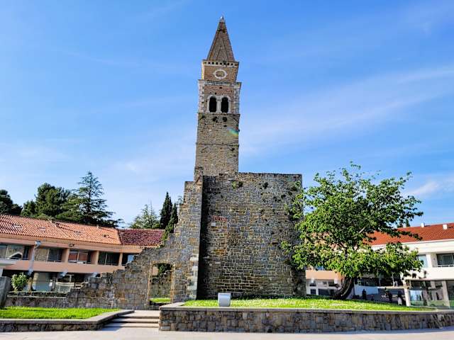 Da wir im Hotel Histrion wohnten, kamen wir jeden Tag nach den Ausflügen bei dieser Sehenswürdigkeit vorbei. Früher war dies ein Kloster mit seiner Klosterkirche stammend aus dem 15. Jhdt., gewidmet dem "Heiligen Bernhardin" von Siena. Leider ist von all dem nur mehr der Glockenturm, ein Presbyterium und eine Stützmauer mit Bögen erhalten geblieben. Im 19. Jhdt. wurde das Kloster geschlossen und die Armee nutzte es als Festung zur Verteidigung der Bucht.