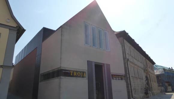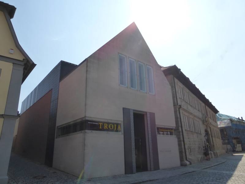 Am südöstlichem Rand des Iphofener Marktplatzes, Ecke Maxstraße, befindet sich das äußerst sehenswert Privatmuseum „Knauf-Museum Iphofen“. Es befindet sich im historischem „Rentamt“ (erbaut 1688 bis 1693 – als Nachfolgebau eines im 30-jährigen Krieges zerstörtem Vorgängerbaus). Außerdem ist diesem Gebäude ein moderner Erweiterungsbau angeschlossen (erbaut 2008 bis 2010). Im „Altbau“ befindet sich die Dauerausstellung. In der Dauerausstellung sind Ausstellungsstücke des Altertums (keine Originalwerke, sondern Gipsreplike, teils in Originalgröße, teils Verkleinerungen). Gezeigt werden Stücke aus Ägypten, Mesopotamien, Rom, Griechenland, Indien, Mittel- und Südamerika. Im Erweiterungsbau, in dem heute auch der Eingang zum Museum ist, finden immer Sonderausstellung statt. Als wir in August 2018 in Iphofen waren, war hier die Sonderausstellung „Heinrich Schliemann – TROJA“ (diese wird bis Anfang Nov. 2018 im Knauf-Museum gezeigt). Dazu stand auf dem Marktplatz ein großes, ca. 6 Meter hohes Holzpferd (Trojanisches Pferd) – als Werbung für diese Ausstellung. Sowohl die Sonderausstellung, als auch die Dauerausstellung hatten uns sehr gut gefallen und wir hatten dann doch mehr Zeit im Knauf-Museum Iphofen verbracht, als wir uns ursprünglich vorgestellt hatten.