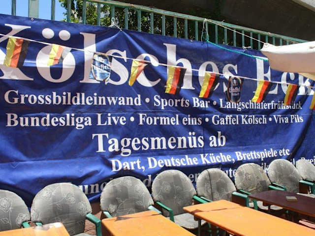 Familien geführte Sport´s Bar mit kölschen und Rheinländischen Lebensgefühl ! Die Kneipe liegt am Hotel RIU Papayas und Eugenia Victoria auf der Strasse " Avenida de Gran Canaria " im Einkaufszentrum " Jardin del Sol " . Wir sind aus Maspalomas immer mit den Taxi dort hingefahren und haben dem Taxi Fahrer einfach Jardin del Sol gesagt und schon gings im Prinzip direkt vor die Tür. Kostenpunkt max. 3 € von wo auch immer. Bis ans rechte Ende des Einkaufszentrums direkt an einer Brücke gelegen. Die Kneipe ist wunderschön bemalt worden mit dem Kölner Dom, eine Art Kölscher Skyline, mit Fernsehturm und der üblichen Altstadt. Toller Effekt noch dazu, das ganze leuchtet Abends im Neonlicht. Die Sport´s Bar verfügt über ca. 30 Sitzplätze draussen und innnen sinds meines Wissen ca. 80 Sitzplätze. Die sind auch bitter nötig, da wenn Fussball läuft und gute Spiele laufen, der Laden aus allen Nähten platzt. Der Schwerpunkt der Kneipe liegt auf jedenfall im Bereich Sport, das merkt man auch bei grossen Ereignissen wie z.b. bei der EM 2008. Wir waren zu dem Zeitpunkt dort, und waren überwältigt. Die Familie hat dort eine Art "Puplic Viewing" veranstaltet, ich weiss nicht wieviel Sitzplätze es waren aber es waren auf jedenfall über ! 400 !, die auch komplett ausgereizt waren. Ich vergebe auf jedenfall meinen persönlichen Preis und auch die Achtung, was dort aufgezogen wurde. Allein der Aufbau war riesig. Wenn man im Kölschen Eck sitzt, braucht man sich keine Gedanken zu machen, etwas zu verpassen bzw. nix zu sehen. Bei der EM 2008 - waren es - !! 16 !! TV´s sowie 2 Grossbildleinwände, die Aussen sowie Innen aufgebaut wurden. Ich glaube bei normalen Betrieb haben die 7 TV´s und 2 Grossbildleinwände immer im Laden aufgebaut, sollte sowas wie Champions League Spiele mit deutscher beteiligung stattfinden wird auch laut Aussage von Rene (Technik Spezi) noch 3 weitere TV´s aufgebaut und auch die Terasse erweitert für mehr Platz. Gezeigt wird im Kölschen Eck, glaube ich, alles was mit Sport zu tun hat, die senden/zeigen auch Spiele die gar nicht im deutschen TV zu sehen gibt (z.b. Uefa Cup Spiele im Ausland - kennen wir ja alle) zwar dann ohne Ton, da man ihn nicht verstehen würde, aber man sieht´s wenigstens, im gegensatz zu den Bekannten in Deutschland. Preise sind absolut angemessen, wie schon die erste Bewertung von ?Kai? beschrieben wurde. Keine Strand Preise oder so, halt typisch zivile Preise. Biere gibts dort auch genug, Gaffel Kölsch, Viva Pils und Viva Weizen vom Fass. Wem das nicht reicht, gibts noch Tropical sowie Heiniken aus der Flasche. Natürlich auch alle anderen Getränke vorhanden, Softdrinks, Longdrinks Milchshakes etc. Essen kann man auch im Kölschen Eck - halt keine Resturant Karte aber dafür von allen etwas. Lecker deutsche Bockwurst, Wiener Würstchen, Schnitzel (Jäger - Zigeuner - Pfeffer etc.) Currywurst, Hamburger usw. Also ich hoffe ich konnte euch einen kleinen Einblick in meine Besuche des Kölschen Eck geben, wir werden aufjedenfall nächstes Jahr wieder auf Gran Canaria aufschlagen und ins Kölsche Eck gehen ! Grüsse an die Crew