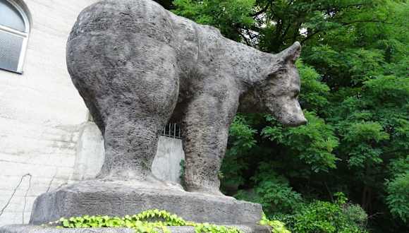 Überlebensgroßer Bär aus Kalksandstein an der Gebsattelbrücke im Stadtteil Au.