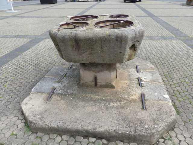 Auf dem westlichen Marktplatz von Bad Königshofen im Grabfeld steht eine steinerne Sehenswürdigkeit, die man beim vorbei gehen für einen Stein mit mehreren Taufbecken halten könnte. Bei näherem Hinsehen entdeckt man jedoch eine Plakette die den Hinweis auf ein Getreide-Eichmaß aus dem Jahre 1525 gibt. Es ist ein alter Konrmessstein mit halbkugelige Becken verschiedenen Durchmessers die nach unten geöffnet sind. Hier konnten die Händler nach „gerütteltem und gestrichen Maß“ das Getreide in die darunter hängenden Säcke rinnen lassen. Die Löcher konnten auch verschlossen werden. Das Getreide-Eichmass der vier Becken waren für ¼, ½, ¾ und 1/1 Metzen vorgesehen.