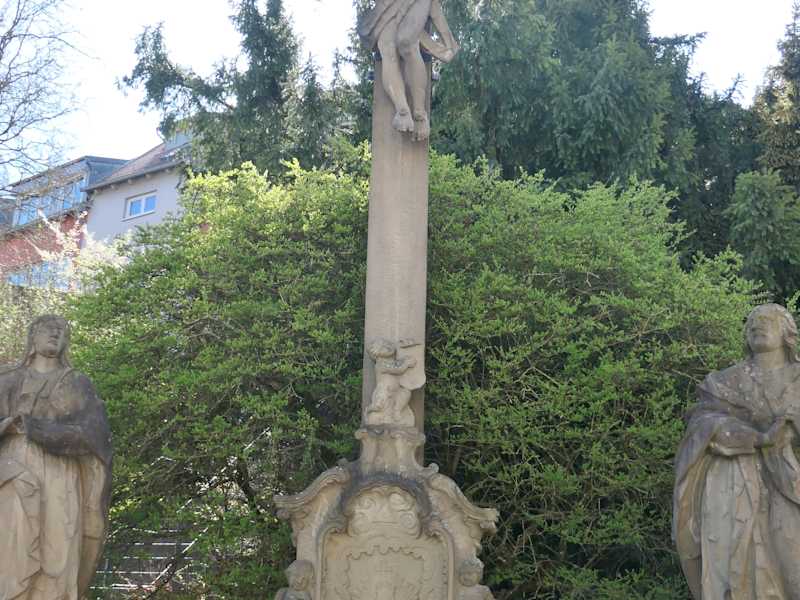 Bei unserem Altstadtbummel durch Bad Neustadt an der Saale sind wir auch über die Straße Am Zollberg gelaufen. Hier Am Zollberg befindet sich eine interessante Kreuzigungsgruppe vor einer halbrund gemauerter Nische. Unter dem Kreuz befinden sich Maria und Johannes , dazu mehrere spätbarocke Figuren Engel.