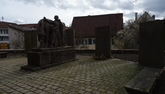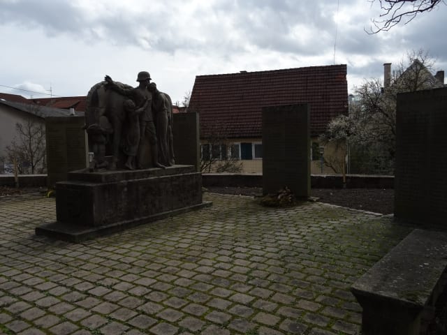 Bei der Jakobuskirche in Filderstadt-Bernhausen findet man das Denkmal für die Gefallenen und Vermissten beider Weltkriege. Vor den Tafeln mit den Namen steht eine Skulptur - ein Soldat mit seiner Familie und einem Pferd. Die Frau und eines der Kinder klammern sich dabei an den Soldaten - im Hinblick auf die Anzahl der Gefallenen und Vermissten welche auf den Stelen dahinter aufgeführt sind eine eindrückliche Darstellung.