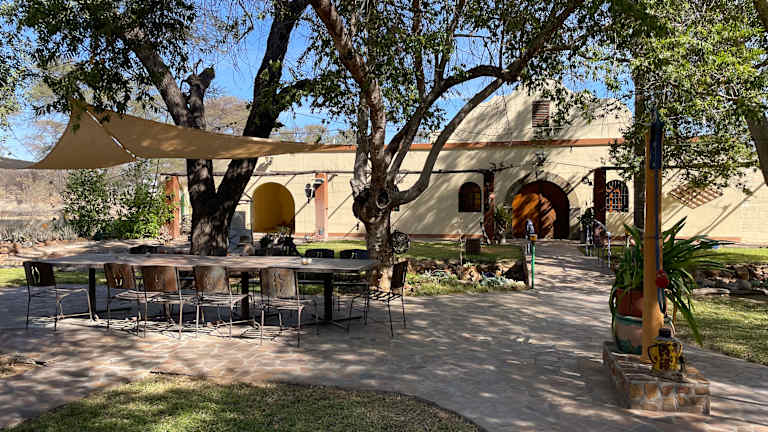 Auf unserer Rundreise hatten wir die Möglichkeit einer Weinprobe in der Kristall-Kellerei Omaruru, der ersten Namibias. Der Kellermeister führte uns durch den kleinen Weinberg (eigentlich ein Weinfeld), erklärte uns die Geschichte dieses Weinberges, berichtete über Versuche die mit verschiedenen Rebsorten durchgeführt wurden und werden und über negative und positive Ergebnisse und Erfahrungen. Hauptsächlich werden zwei Sorten Wein angebaut. Als Schnäpse werden Nappa (Antwort auf Grappa) und Brandy gebrannt. Nach der interessanten und kurzweiligen Führung kam dann die eigentliche Weinprobe, wobei mir persönlich der Weiße sehr gut schmeckte. Im herrlichen Garten wurde ein üppiger Imbiss gereicht, der diese Weinprobe hervorragend abrundete. Das war ein weiteres Highlight dieser Reise und sehr zu empfehlen.