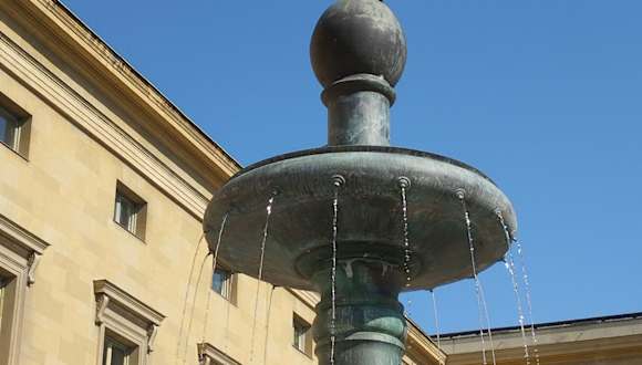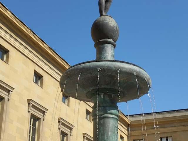Ein schöner Brunnen steht zwischen der Bayerischen Akademie der Wissenschaften und der Allerheiligen-Hofkirche. 1959 wurde der Grundstein für diesen Brunnen gelegt. Er besteht aus drei verschieden großen Becken. Oben thront eine Figur. Es ist die Göttin der Gerechtigkeit. Sie steht auf einer Kugel und hält in der rechten Hand eine Waage und links eine Pallas Athene. Von der Kugel über die Becken läuft Wasser in das große Becken am Boden.