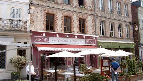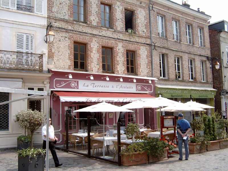 Normandie Nov. 07 Erste Station war das * Restaurant "La Terrasse et Assiette“ in Honfleur Das Restaurant liegt im Herzen der Altstadt von Honfleur. Außen unverputztes Mauerwerk, innen normannisches Fachwerk. Herzlicher Empfang durch die Eigentümerin, als Aperitif ein normannischer Pommeau. Dazu kleine Blätterteighäppchen gefüllt mit allerlei Meeresgetier. Als Amuse bouche wurde in einem hohen Glas eine Mouse von der Jakobsmuschel mit einem Krustentierfond serviert. Geschmacklich in Ordnung, jedoch sehr schlecht aus dem hohen Glas zu bekommen. Wir entschieden uns für das 4 Gang - Menü für 29 €, für das dann gelieferte ein sehr günstiger Preis. 1. Scheibe von der Entenstopfleber mit einer Zwiebelkonfitüre. Die Leber leicht mit Vanille gewürzt, die Zwiebelkonfitüre brachte eine gewisse Süße mit, passte sehr gut zur Leber. Der beste Gang. 2. Jacobsmuscheln gebraten mit Chicorée und einer Granatapfel Sauce. Die Muscheln kurz gebraten, der etwas herbe Chicoree übertönte dabei leider den feinen Muschel -geschmack. Die Sauce schmeckte nach nichts, dafür aber eine leuchtend rote Farbe auf dem Teller. 3. Camembert eingepackt in Speck und gebraten mit Pfefferkaramell und Salat. Mit gebratenem Camembert habe ich so meine Probleme 4. Brochette von frischen Früchten mit Sauce Chocolat und einem Litchegranite. Sehr einfaches Dessert. Aufmerksamer Service