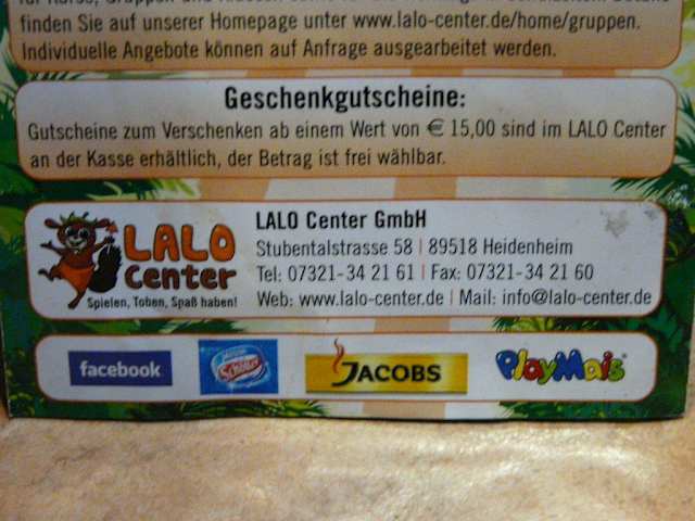 Wir haben Jetzt auch in Heidenheim Lalo Center .Das haben wir auch gleich genutzt um den 5 Geburtstag unseres Sohnes zu feiern und des war toll .Erst dürfen die kinder sich das Thema aussuchen mein Sohn hatte sich für Cars entschieden ,wir Haben das Paket 2 Eintrit den ganzen Tag p.kind 1 Getränk und etwas zu essen für 12 Euro aber das ist noch nicht alles zusätzlich Kann man noch etwas dazu buchen wie (Kinderschminken,Gasballon-Fliegenlassen,Schatzsuche,Sandbildmalen .Die kinder sind aber auch ohne geb.feiern beschäftigt mit Hüpfburg Rutschen einfach toll und die preise gehen auch Kinder 1-3 Jahre 3,50 Euro / Kinder 3-14Jahre 6,50 Euro und Erwachsene 3,50 Euro .wir wissen schon wo wir Nächstes Jahr wieder unseren Kindergeburtstag feiern .