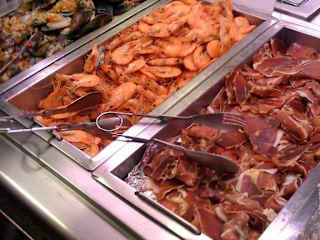 Ich empfehle die Grilltheke, und die reichhaltige Auswahl an kalten und warmen Platten. Auch die Scampis, der Käse und das Eis ist nicht schlecht. Die spanischen Kuchen kann man sich sparen.