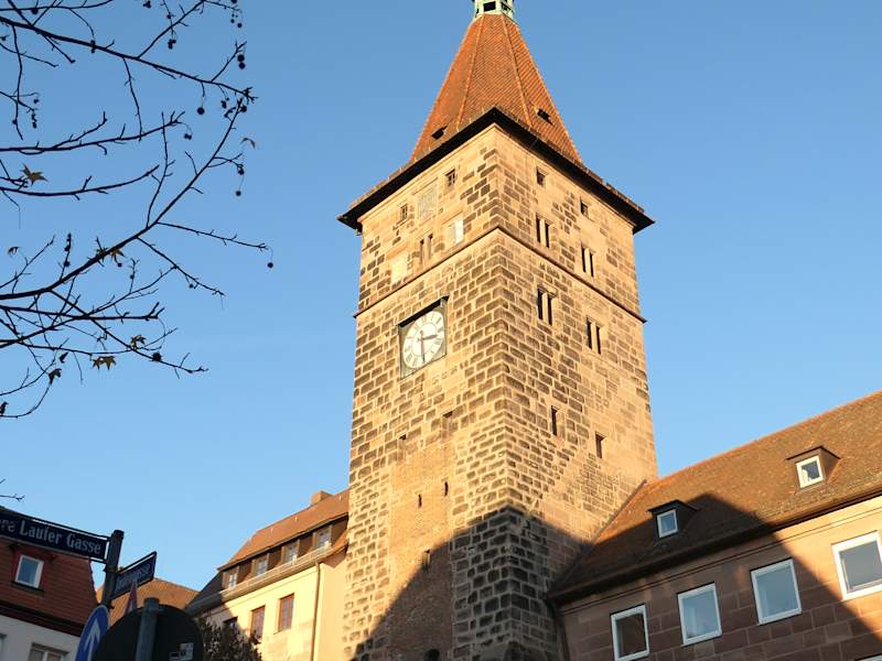 Der Laufer Schlagturm ist ein Torturm und befindet sich in Nürnberg zwischen der Inneren Laufer Gasse und dem Inneren Laufer Platz, ca. 500 Meter östlich vom Rathaus / Rathausplatz. Dieser Torturm dürfte um das Jahr 1250 erbaut worden sein, während die oberen Geschosse und die Verstärkungspfeiler erst 1508 ergänzt wurden. Beim Laufer Schlagturm handelt es sich um einen der wenigen noch heute erhaltenen Türme in Nürnberg, die aus dieser Epoche stammen. Als die alte Reichsstadt Nürnberg 1806 an das Königreich Bayern kam, gab es wohl ernsthafte Pläne zum Abriss des Laufer Schlagturms, was jedoch durch den Widerstand der Nürnberger Bürger_innen verhindert wurde. Man kann einen Abstecher zum Laufer Schlagturm gut mit der Landauer Kapelle und dem Grübelsbrunnen, aber auch mit dem Egidienplatz (mit dem schlafendem Nashorn, der Egidienkirche, dem Pellerhaus und dem Reiterstandbild von Kaiser Wilhelm I.) verbinden.