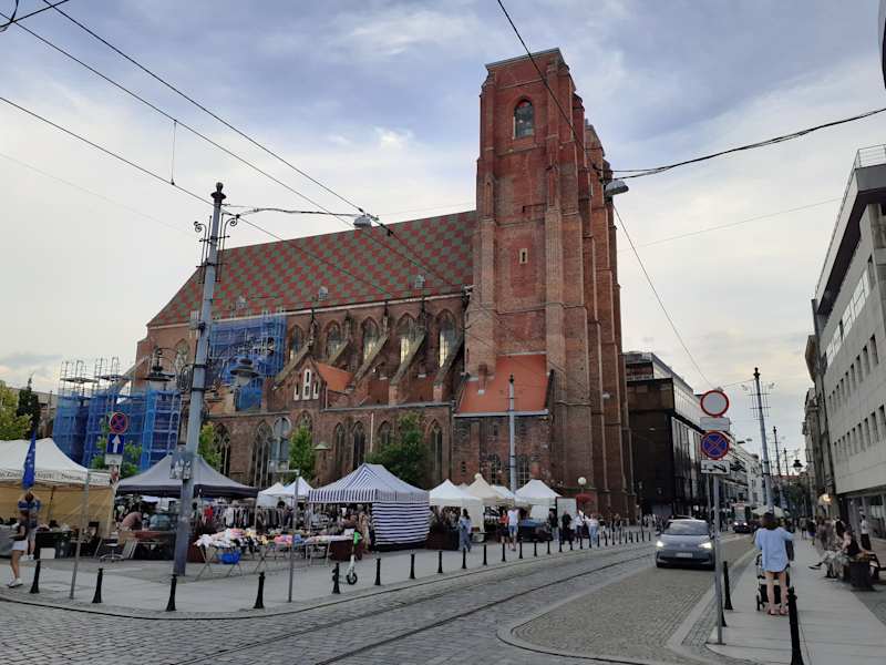 Sie fällt sofort auf die Maria-Magdalena Kirche mit ihrer Büßerinnenbrücke. Dort sollen nachts die Seelen der Büßerinnen herumgeistern. Die Brücke ist die ideale Aussichtsplattform, sie verbindet in 47 m Höhe die beiden Kirchtürme und man hat einen schönen Blick über die Altstadt. Der spätgotische Backsteinbau war die Kirche der Zünfte und Bürger. Sie ist eine der beiden ältesten Pfarrkirchen, aus dem 13 Jahrhundert, von Breslau.