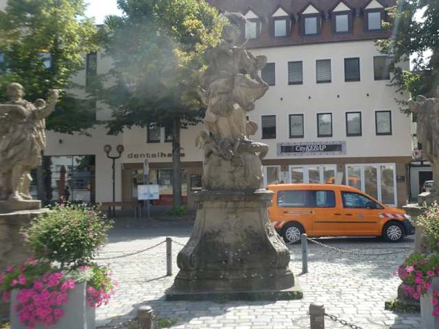Die Mariengruppe auf dem Paradeplatz von Forchheim stammt aus der Mitte des 18. Jahrhunderts. Diese Gruppe mit Maria und zwei Engeln ist nach meiner Meinung durchaus sehenswert. ANMERKUNG: Noch steht die Mariengruppe auf dem Paradeplatz. Da dieser Platz jetzt umgestaltet werden soll, ist es anscheinend noch fraglich, ob die Mariengruppe hier verbleibt oder ob ihr ein neuer Standort zugeteilt wird und wo sie schließlich einen (hoffentlich würdigen) Platz finden wird. (Angaben Stand September 2021)