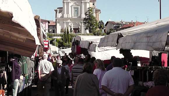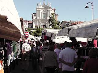 Jeden Freitagvormittag ist in Manerba Markttag. Er findet unterhalb der Kirche auf der Via Kennedy und den umliegenden Straßen statt. Der Markt ist nicht übermäßig groß, aber der Trubel macht immer wieder Spaß. Einheimische und Touristen sind bunt gemischt und beide Gruppen finden genügend Angebote für einen Einkauf. Ob frisches Gemüse oder frittierten Fisch, ob Jeans und Jacken aus Vietnam, Socken im Zwölferpack oder reichhaltig geformtes Porzellan, Unterwäsche oder frische Blumen, Hundehalsbänder oder Fahrradschlösser, alles bunt gemischt. Hier kann man gut herumbummeln - und danach bietet sich ein Besuch im Cafe oberhalb des Marktbereichs an der Via Filippo Turati an oder der Besuch der Ortskirche mit der pompösen Fassade.