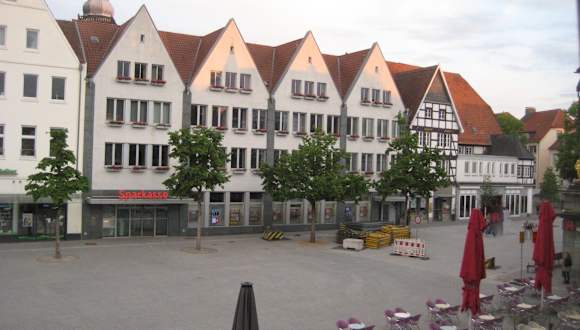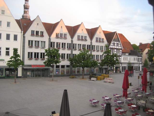 Der Marktplatz ist ein großer Platz mit Cafés, Restaurants drum herum. Das war’s. Wirklich ansprechend, schön fand ich es dort nicht. Ist natürlich Geschmackssache. Aber ich habe mich gefreut, als ich beim Stöbern im Netz nach Infos zum Markt auf Hinweise stieß, dass der Marktplatz umgestaltet werden soll – durch Bepflanzungen, Wasserspiele und mehr Bänke, Sitzplätze. Eine super Idee. Einzelheiten zum derzeitigen Stand: Rechtsseitig fällt das schöne alte Fachwerkhaus mit den zwei Giebeln ins Auge. Es handelt sich dabei um das historische Gasthaus „Im Wilden Mann“ (von 1511). Oben an der Ecke Walburgerstraße ist der Grundriss des früheren Prangers auf dem Pflaster zu sehen. Ansonsten… der Wochenmarkt soll heute nicht mehr auf dem Marktplatz stattfinden, sondern auf dem Veithof abgehalten werden. Kurz zur Geschichte des Markts: Vor 1180 fand der Markt wohl außerhalb der Stadtmauern statt – und zwar an der Stadt-/Wallmauer entlang. Es war eine Art Straßenmarkt. Zum Pranger: Man wurde in Soest nicht an den Pranger gestellt, man wurde „auf den Kack“ gesetzt = man saß – festgebunden – am Pranger. (Vermutlich etwas bequemer :-) (Quellen: stadtfuehrung-soest.de / hellwegradio.de )