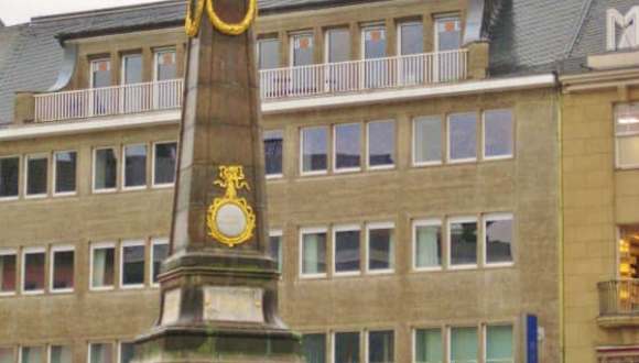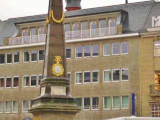 Auf dem Marktplatz war am Samstag… natürlich Markt. :-) Das wäre gewiss richtig nett gewesen, wenn es nicht gerade mal wieder kräftig geregnet hätte. So aber war es mit all den Regenschirmen nicht soo "gemütlich". Zusätzlich wurde der Obelisk von den Marktständen bzw. von den Autos ihrer Besitzer belagert, so dass ich ihn nicht wirklich gut anschauen konnte. Aber die dortige Tafel für den Fürsten konnte ich abfotografieren. Der gesamte Text darauf lautet: „Max Friedrich, bester Fürst, Schutz, Vater, Freund der Deinen, Sieh Ehrfurcht, Liebe, Dank dein treues Volk vereinen. Du grubst dein Denkmaal selbst in unsre Herzen ein. Nachwelt, du sollst davon hier unsre Zeuginn seyn.“ (etw. andere Rechtschreibung als heute) Kurfürst Maximilian Friedrich ließ den Obelisken im Jahr 1777 errichten. Er steht in einem Wasserbecken, das auch die Marktfontaine genannt wird. Nicht weit davon entfernt erkennt man auf den ersten Blick den schönen Bau des Alten Rathauses. (Dazu gibt es einen gesonderten Reisetipp.) Insgesamt gefiel mir der Marktplatz gut. Er wird zum ersten Mal im 11. Jahrhundert erwähnt. Wichtig war er natürlich für die Kaufleute und Handwerker, diente allerdings auch als Tagungsort für das Schöffengericht. Im 17. Jahrhundert soll es dort dann vier Apotheken, weiterhin Bäcker, Brauer, Barbiere und einen Goldschmied gegeben haben und - bis 1730 - einen Pranger. Quelle zum Platz: Lehmstedt Verlag Leipzig