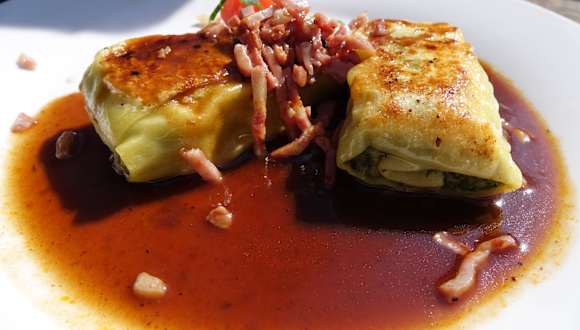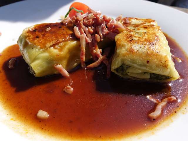 Oberhalb der Nebelhöhle in der Gemeinde Sonnenbühl-Genkingen gibt es ein Restaurant mit dem Namen Maultaschenwirt. Es gibt aber auch andere Gerichte, die nach Tagesform angeboten werden. Im Innenraum findet man ein uriges Restaurant, aussen kann man bei schönem Wetter auch Platz nehmen. Die Qualität der Maultaschen sind in Ordnung, die Beilagen wie Saucen verlangen aber nach einer Verbesserung. Meine Frau hatte Maultaschen mit Specksauce, ich hatte die Taschen mediterran. Mediterran bedeutet hier, Tomatensauce heiß gemacht mit Zwiebeln und anderes Gemüse das angebraten war und untergemischt wurde, nicht mein Geschmack. Seltsam war, daß bei mir ein Stückchen Ananas als Deko auf dem Teller lag, ja wachsen am Mittelmeer jetzt Ananas ? Leider nicht zu empfehlen, obwohl die Maulis in Ordnung waren.