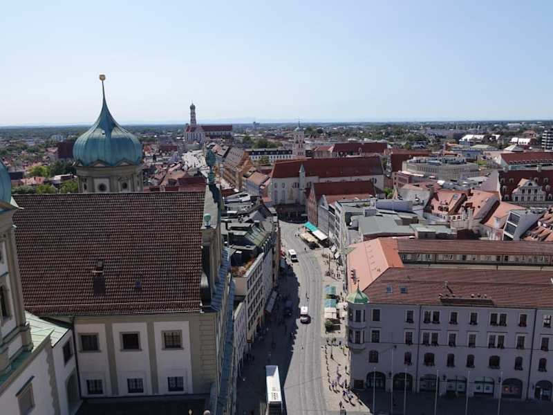 Diese Straße ist in Deutschland bedeutsam, die Augsburger nennen sie einfach Maxstraße. Heute besitzt die Straße Bauten aus der Gotik, Renaissance, Rokoko bis zu den Nachkriegshäusern. Sie verläuft von Nord nach Süd. Sie war schon in der Römerzeit eine Verbindung die sich Via Claudia Augusta nannte, und über Füssen, dann über die Alpen nach Rom führte. Sie ging allerdings damals vom Rathaus bis zum Merkurbrunnen. Dann zweigte sie links ab über die Dominikanergasse in Richtung Haunstätter Straße. Sie gehört heute auch zur Romantischen Straße, der längsten und auch schönsten Straße der BRD. Die heutige Maxstraße gliederte sich ab dem Mittelalter als Weinstraße bis zum Ulrichsplatz, daß war aber mehr ein aneinander verbindender Platz für Märkte. Der wichtigste war der Weinmarkt. Auf diesem wurde Reichstage, Turniere und auch Prozessionen abgehalten. Es war damals wie auch heute eine breite Straße, in der Mitte stand das Siegelhaus mit verschiedenen Händlern, das Siegelhaus wurde 1809 abgebrochen. Der heutige Herkulesbrunnen blieb aber auf der Straße stehen. Die schönen Sehenswürdigkeiten auf der Maximilianstraße sind die Fuggerhäuser, das Schaetzlerpalais, der Merkurbrunnen, das Weberhaus und auch die Kirche St. Moritz. Zum Glück wurden die Gebäude an der unteren Maximilianstraße beim Luftangriff der US-Amis und der Briten im Febr, 1944 nicht getroffen, leider jedoch die Häuser auf der oberen Maximilianstraße. Die Angriffe sollten allerdings die Flugzeugwerke Messerschmitt und das MAN Werk treffen. Einerseits wurden im Flugzeugbau die damaligen schnellsten Jagdflugzeuge gebaut und bei MAN die Motoren für die U-Boote.