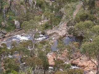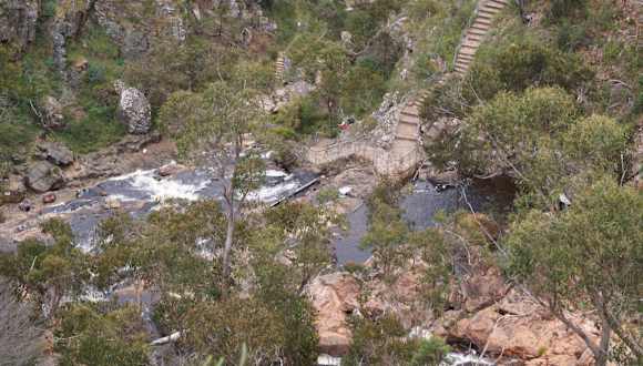 Im Grampians National Park sind die Wasserfälle bei weiten nicht die Hauptattraktion., wie im Reiseführer so gern beschrieben wird. Mit Halls Gap als Ausgangspunkt kann man die Grampians auf einer langen Rundfahrt erkunden. Zwischendurch immer mal aussteigen und ein Stück wandern. Es gibt viele Panoramapunkte, die mit herrlichen Ausblicken überraschen. An der Mount Victory Road liegen mit den McKenzie Falls die bekannten Wasserfälle des NP. Eine kurze Wanderung vom Parkplatz führt auf einen Stufenpfad hin u. zurück 1,5 km / 1h.