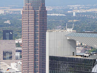 Der "MesseTurm" liegt an der Friedrich-Ebert-Anlage und bildet den östlichen Abschluss des Messegeländes von Frankfurt am Main. Der Wolkenkratzer, der zwischen 1988 und 1991 nach den Plänen des US-amerikanischen Architekten Helmut Jahn im Art-déco-Stil errichtet wurde, galt nach seiner Fertigstellung mit einer Höhe von 256,50 Metern bis zum Jahr 1997 als das höchste Bürogebäude in Europa. Er hat 70 Stockwerke, von denen 63 als Büroetagen genutzt werden. Auffallend ist die Gebäudestruktur mit Sockel, Turm und Spitze, die an die amerikanische Hochhaus-Architektur der zwanziger Jahre erinnert. Der Turm wird von einer 36,30 Meter hohen Pyramide gekrönt, die einem angespitzten Bleistift ähnelt. Ein ähnlicher Wolkenkratzer befindet sich in Atlanta/USA, das Hochhaus der Bank of America Plaza. Neben dem Messeturm steht der von dem US-amerikanischen Künstler Jonathan Borofsky geschaffene Hammering Man, einem Arbeiter, der einen Hammer gegen ein symbolisches Werkstück bewegt. Homepage: https://messeturm.com/