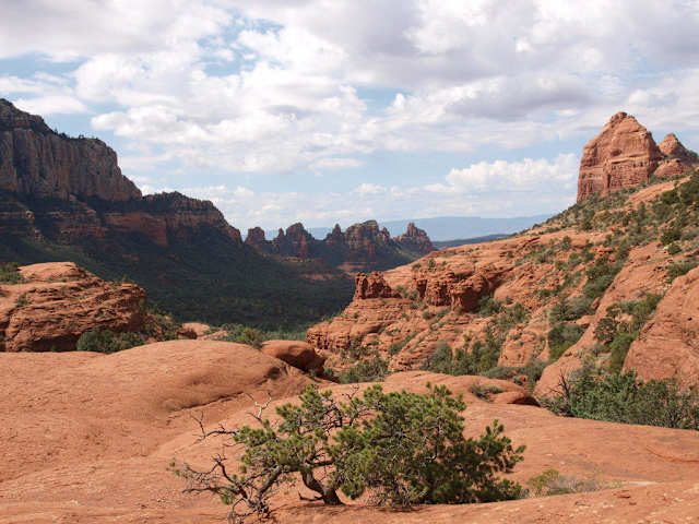 Die Mitten Ridge und die Cowpies sind ein kleiner Teilbereich der herrlichen Red Rocks rund um Sedona und befinden sich gleich östlich der Stadt. Sie sind über die Schnebly Hill Road zu erreichen (Abzweigung nahe der "Künstlerstadt" Tlaquepaque Richtung Nordosten). Leider ist nur der untere Teil der Straße asphaltiert, der Rest ist eine Schotterpiste. Mit genügend Bodenfreiheit kann man den Parkplatz beim Beginn des Weges (beschildert) erreichen, wir haben es aber vorgezogen unseren Mietwagen am Ende der ausgebauten Strecke stehen zu lassen und den Rest der Schnebly Road raufzuwandern (hier gibt es Toiletten, achtung: Park- bzw. Eintrittsgebühr für die Red Rocks, ca 4 Euro pro Fahrzeug, Automat). Man muß für die zusätzliche Strecke zu Fuß etwa eine knappe Stunde pro Richtung rechnen. Die Straße liegt zwar landschaftlich recht schön, die ständig vorbeifahrenden Touren Jeeps haben aber ein wenig gestört. Parallel dazu führt ein Wanderweg, aber auf der Straße ist man schneller. Trotzdem lohnt sich die Wanderung. Der eigentliche Wanderweg führt dann zuerst zu den Cowpies, einem kleinen Felsplateau mitten im Tal, das durch seine Form von Weitem an Kuhfladen erinnert. Das Plateau gilt als einer der Vortex Punkte rund um Sedona, und soll spirituelle Kraftfelder besitzen (Sedona ist ja eine Art Treffpunkt für Esotheriker). Steinkreise markieren diese Kraftfelder. Auch wenn man nicht daran glaubt, die Aussicht ist recht schön. Gleich über den Cowpies erhebt sich die Mitten Ridge, eine Kette roter Felsen. Über einen felsigen Hang gelangt man weiter auf einen Sattel (zwar kein markierter Weg, aber für etwas geübte Wanderer problemlos zu erreichen). Der Blick von hier oben ist super schön und lohnt meiner Meinung nach die Mühe. Man kann den gleichen Weg wieder zurückgehen. Wenn man trittsicher und schwindelfrei ist, kann man auch (etwa auf Höhe des Sattels am Fuß der Felsen entlang) Richtung Sedona weitergehen (weitere tolle Ausblicke). Etwas weiter westlich beim nächsten Sattel (ca. 45 Minuten) trifft man dann wieder auf einen Weg der zuerst nördlich der Felsen vorbei und dann beim dritten Sattel retour runter zur Schnebly Hill Road führt. Diese Variante empfehle ich aber nur wirklich geübten Wanderern. Egal für welche Variante man sich entscheidet, die Umgebung und Ausblicke sind toll.