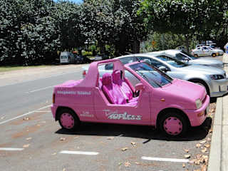 In Nelly Bay, dem Örtchen, in dem man auf Magnetic Island landet, wenn man die Fähre ab Townsville nimmt, findet sich eine etwas "andere" Mietwagenfirma. Bei MOKE-MAGNETIC (112 Sooning Street) kann man sich preiswert einen Moke mieten, einen englisch/australischen Mini-Strandbuggy aus den siebziger Jahren mit primitiver Technik und eingebauter Spaßgarantie. Dieses Vehikel fuhr James Bond in "Man lebt nur zweimal" und es ist eigentlich nur noch auf Magnetic Island in regulärem Betreib zu sehen. Das Straßennetz der Insel ist sehr klein und man kommt mit den sechzig Freikilometern gut und gerne 3x an alle befahrbaren Orte. Anders geht's sowieso nicht, denn es gibt keine Tankstelle! Wer also ein Freak skurriler Autos ist, sollte Magnetic Island unbedingt mit einem Moke erkunden. Es ist wirklich zum wegschießen und keine Angst, wenn die Bremse mal nicht will: Zwei, dreimal Vorpumpen hilft und so schnell seid ihr mit dem alten Klapperkasten sowieso nicht.