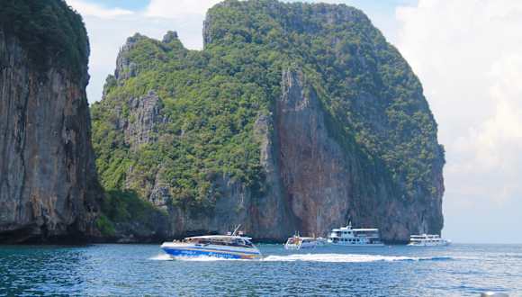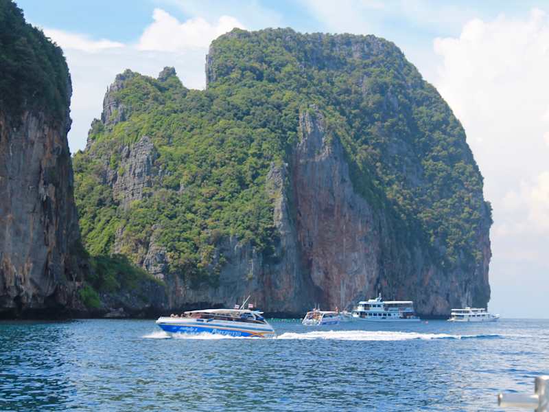 auf dem Weg zu den Phi Phi Inseln machten wir als erstes Stopp auf der Affen-Insel. Man bekommt außer dem kleinen Strand nicht viel zu sehen, das witzige sind die dort lebenden Affen, sie sind handzahm und sehr frech. Sie klauen alles was nicht niet und nagelfest ist, einem Gast haben sie sogar die Cola Flasche entwendet, meine Brille wäre auch fast weg gewesen. Extra auf diese Insel fahren lohnt nicht, aber als Stopp ist sie OK.