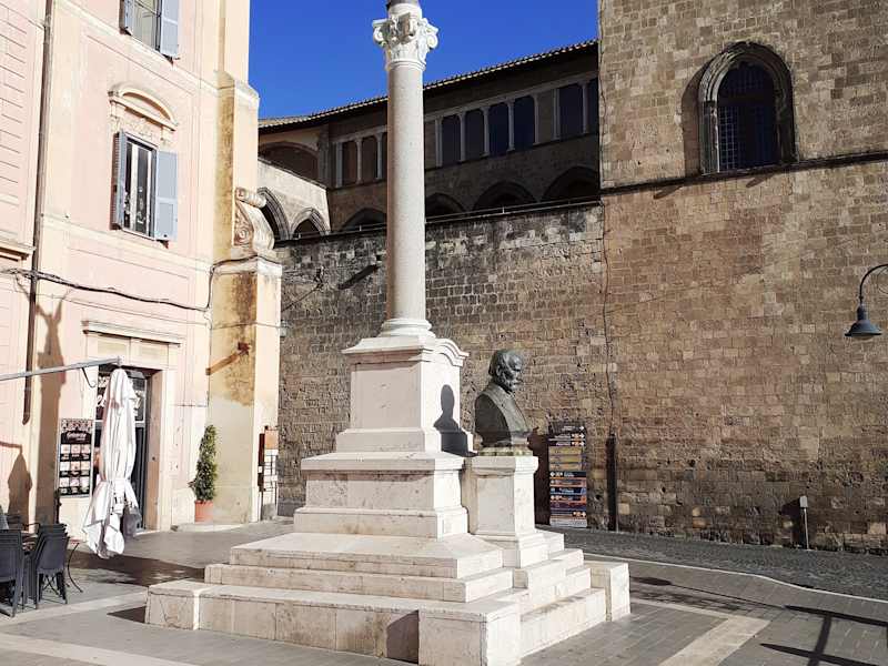 Giuseppe Mazzini war ein im 19. Jahrhundert lebender italienischer Philosoph, Journalist, Politiker und Freiheitskämpfer. Sein politisches Ziel war das Selbstbestimmungsrecht der europäischen Völker und vorrangig die Einigung der italienischen Staaten, die damals noch in verschiedene Territorien aufgeteilt waren. Das von ihm propagierte Konzept eines „Europas der Völker“ galt damals noch als schwärmerische Utopie, Mazzini war damit aber ein früher Vordenker der modernen Europäischen Union. Das Denkmal mit seiner Büste wurde 1923 an der Piazza Cavour, am Eingang zur Altstadt von Tarquinia aufgestellt.