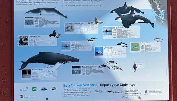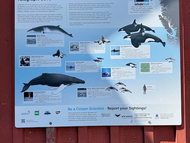 The Whale Interpretive Centre befindet sich am Ende der historischen Promenade von Telegraph Cove. Es ist eine Art Museum, in dem die Öffentlichkeit auf die Bedrohung der Meeressäugern hingewiesen wird. Das Bewusstsein für den Lebensraum, Bedürfnisse und Gefahren für die Schwertwale, Finnwale, Buckelwale und Seeotter sowie andere lokale Meeressäuger soll erhöht werden. Es werden diverse Skelette von Meeres und Landbewohnern gezeigt. Der Höhepunkt der Ausstellung ist das Skelett eines Finnwal, der durch ein Schiff gerammt wurde vor Vancouver. Für uns war es eine gute Einstimmung für unsere Whale Watching Tour. Der Eintritt ist freiwillig und beträgt für Erwachsene 3 $ und Kinder 1 $, das Center wir nur über Spenden finanziert.