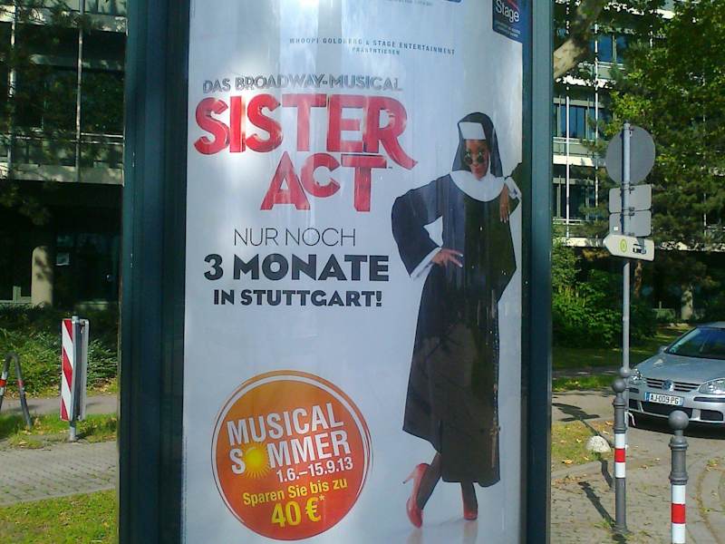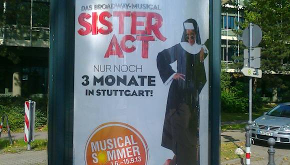 Sehr kurzfristig haben wir 2 Karten geschenkt bekommen und besuchten Sister Act in Stuttgart. Völlig unvoreingenommen und ohne Vergleichsmöglichkeiten, da wir weder Film noch Inhalt kannten. Gesamte Spielzeit 2 Std. 15min. mit einer halbstündigen Pause. Unser Fazit: sehr unterhaltsam und kurzweilig, jedoch sicher nicht für Hardcore-Katholiken.
