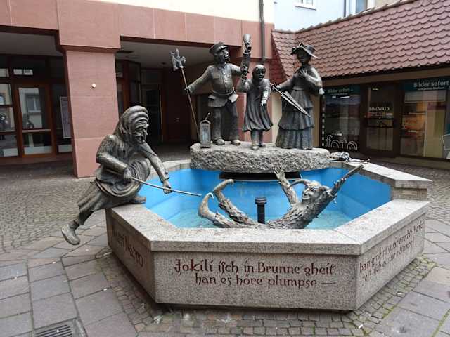 Ein wenig versteckt im Innenhof des Rathauses steht ein Narrenbrunnen des Künstlers Hubert Bernhard. Am Beckenrand kann man "Jokili isch in Brunne g´heit, han e höre plumpse. Han gmeint s wär e gescheite Mensch jetz isch es nur e Stumpe" zu lesen. Die 5 Figuren des Brunnens stellen wohl Narrenfiguren einer regionalen Narrenzunft dar. Sehr schönes Fotomotiv.