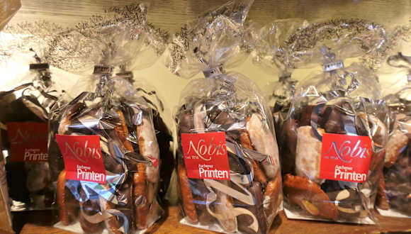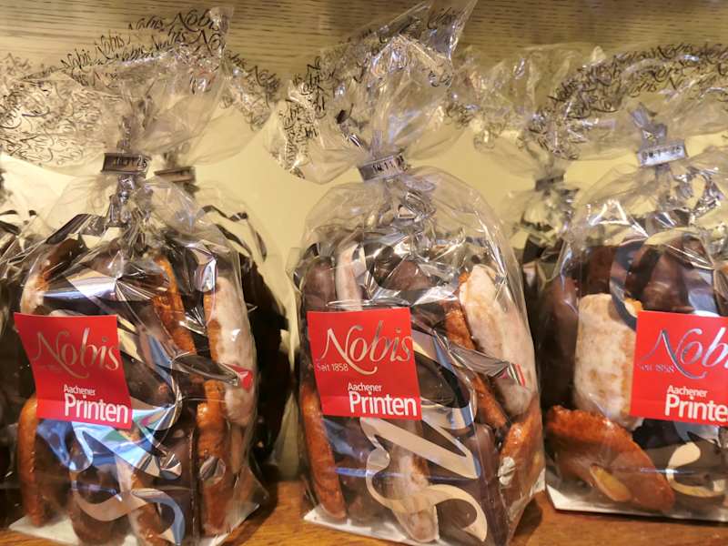 Die Bäckerei Nobis ist berühmt für ihre Printen und unterhält in Aachen über 40 Filialen, in denen man nicht nur Brot, Brötchen und Feingebäck, sondern eben auch diese ganz besondere Lebkuchen-Spezialität der Stadt in vielen Varianten kaufen kann. Mein Favorit ist dabei die Filiale am Münsterplatz, in der es das Vollsortiment in allen Größen und in hübschen Verpackungen zu kaufen gibt: Kräuter-, Prinzess- und Schokoprinten, Weichprinten und Hausspezialitäten wie die „Domspitzen“, unter deren Schokoguss sich Printe und süßes Marzipan verbergen. Eine Besonderheit ist die gläserne Manufaktur, die sich etwas versteckt hinter dem Tresenbereich der Bäckerei befindet – hier wird der Printenteig vor den Augen des Publikums ausgerollt, in Form gebracht und auf den Backblechen verteilt – besonderes für Kinder ein großer Spaß!