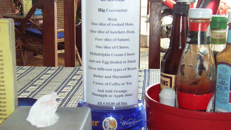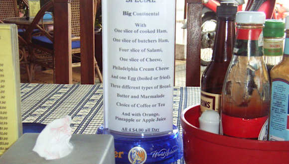 Das Oasis Pizza Restaurant liegt auf der rechten Seite ca. 200 > 300 m von der Kreuzung entfernt . An der Ecke befindet sich eine Tankstelle , wo es dann zum großen Markt geht . Ab 7 > 10 Uhr Früh , gibt es nicht nur Pizza im Angebot lt. Speisekarte , sondern auch ein für 3 Dollar amerikanisches Frühstück . Entweder stellt man sich alles selbst zusammen von der Karte oder sieht sich das für 4 Dollar ( amerik. spezial Frühstück ) das Hinweisschild an am Tisch .
