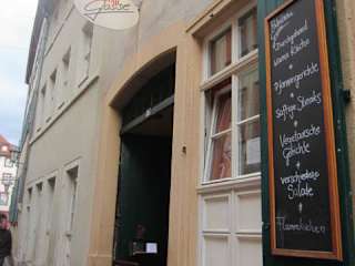 Wir nahmen unser Mittagessen im Restaurant Palmbräugasse auf der Hauptstraße (Nr. 185) ein. Kaum Platz genommen näherte sich ein Ober mit einer Schale Wasser für unseren Hund. Wir orderten Bier im Steinkrug sowie Rahmgeschnetzeltes und Maultaschen. Das Essen mundete gut, das Bier noch besser, und dies in überaus gemütlicher Atmosphäre! Außer dem Restaurationsbereich gibt es auch noch einen Barbereich (Ausgang zur Unteren Straße). Preise Januar 2011: Steinpils 0,5 l 3,90 EUR; Steinkellerpils 0,5 l 4,10 EUR; Maultaschen mit Salat 9,90 EUR, Putengeschnetzeltes 13,90 EUR.