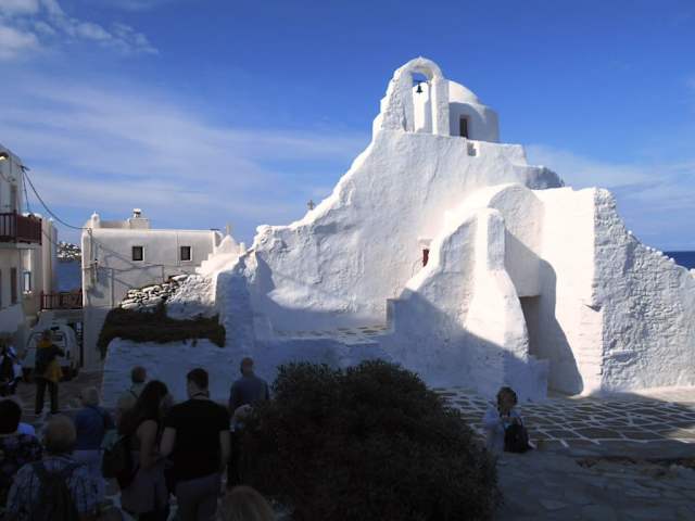 Das wohl bekannteste Bauwerk von Mykonos (außer den Windmühlen ) ist die Kirche Panagia Paraportiani. Wen man vor dieser Kirche steht, ist man fasziniert von der asymetrischen Form dieses Gebäudes. Man sagt, das eine kleine Kapelle bis zu sieben mal mit einer neuen Kirche überbaut wurde, bis letztendlich diese eigenartige Form entstand. Durch ihre blendend weiße Farbe ist diese Kirche bei Fotografen sehr beliebt. Jeden Abend scharen sich Massen von Touristen, um den Sonnenuntergang hinter der Kirche festzuhalten. Unser Versuch die Kirche zu besichtigen schlug leider fehl. Sie ist wohl nur sehr selten geöffnet. Zu Finden ist die Paraportiani am nördlichen Ende von Mykonos Stadt. Zwichen Kastro und Klein Venedig.