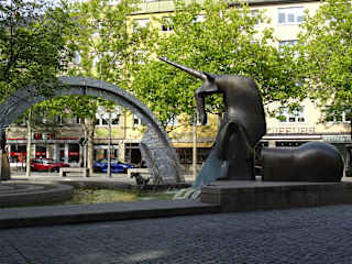 Der große Brunnen wurde 1995 vom Künstler-Ehepaar Rumpf entworfen. Hier findet man etliche Tierdarstellungen - unter anderem auch einen Drachen, der laut Plakette Trinkwasser speit (das Wasser im Brunnen ist kein Trinkwasser).