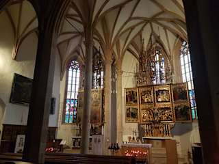 Ich habe auf unseren Reisen noch nie eine Kirche gesehen, die mich alleine von der Lage her so beeindruckt hat, wie die Kirche Maria Himmelfahrt in Hallstat. Sie liegt oberhalb des kleinen Ortes und dem See in einer tollen Lage mit dem direkt angrenzenden Friedhof. Die Kirche stammt um das Jahr 1505 und ist die katholische Pfarrkirche des Ortes. Über dem Eingang gibt es 2 Fresken, die aussenliegend schon etwas besoneders darstellen. Eine Besonderheit stellt der Kreuzaltar dar, der Kunstwerk gilt.