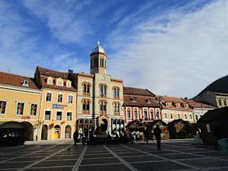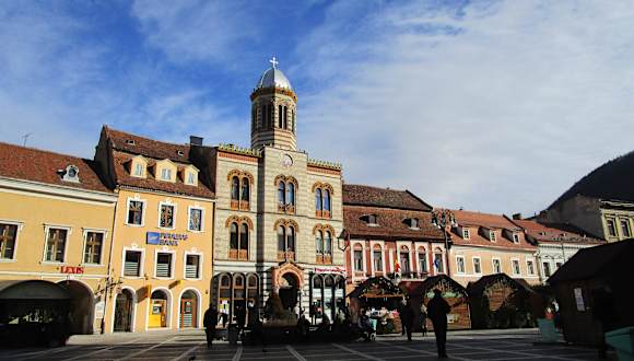 Brasov (Kronstadt) wurde im 13. Jahrhundert vom Deutschritterorden gegründet. Im Mittelalter wurden hier auf dem zentralen Platz Kronstadts große Märkte abgehalten. Der fast dreieckige Platz besticht durch seine Harmonie. Auf und rund um den belebten Platz mit seinem Brunnen, den Bänken, den Café- und Restaurantterrassen, den Kneipen, den Geschäften pulsiert das Leben. Der Platz wird umsäumt von schön restaurierten Wohn- und Geschäftshäusern in vielen verschiedenen Farben und geschichtsträchtigen Gebäuden, z.B. das Hirscherhaus, das früher eine Markthalle war. Auch die neobyzantinische orthodoxe Kathedrale aus dem 19. Jh. auf der Ostseite des Rathausplatzes ist absolut sehenswert, ebenso die sehr bekannte größte gotische Kirche Osteuropas, die Biserica Neagra (Schwarze Kirche). Das Hirscherhaus von 1545 an einer Ecke des Rathausplatzes war einst das größte Gebäude, das die Witwe Apollonia Hirscher der Stadt schenkte. Hier konnten die verschiedenen Zünfte ihre Waren lagern, ausstellen und verkaufen. Heute beherbergt es das Restaurant „Cerbul Carpatin“. Dieser schöne Platz hat viel Flair und wird nicht nur von vielen Touristen, sondern auch von Einheimischen gut besucht.
