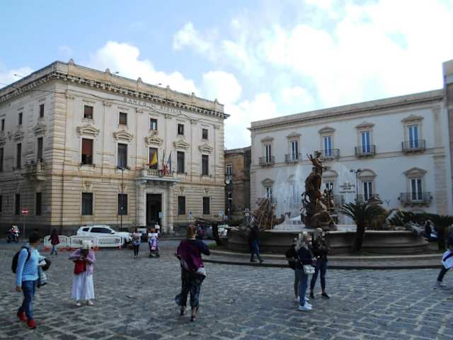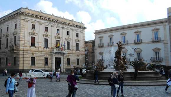 Der Mittelpunkt der Stadt, umgeben von Stadtpalästen aus dem 14. und 16. Jahrhundert. Hier gibt es den Uhrenpalast, der heute von der Banca d´Italia bewohnt wird , dan der Palazzo Montaldo sowie dem Palazzo Lanza. In der Mitte steht der Brunnen der Artemis, hier wird dargestellt wie sich die Nixe Arethusa mit Hilfe der Göttin Artemis langsam in eine Quelle verwandelt. Sie wurde von einem Jäger belästigt, wollte aber nichts von ihm wissen, so wollte sie lieber eine Quelle sein.