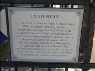 Das als „Pilatushaus“ bekannte Gebäude in Oberammergau in der Ludwig-Thoma-Straße 10 ist wohl das schönste Haus von Oberammergau. Das Pilatushaus wurde 1774 bis 1775 erbaut, nachdem das Vorgängerhaus 1774 abbrannte. Mit seinen Fresken / Lüftlmalereien, die 1784 von dem bekannten Lüftlmaler Franz Seraph Zwink geschaffen wurden, ist es das bekannteste Haus mit Lüftlmalereien von Oberammergau sein. Die Fresken sind äußerst aufwendig gestaltet und wirken äußerst plastisch. Bei dieser „Scheinarchitektur“ hat man den Eindruck, als würden Säulen, Portale, Balkon, die abgebildeten Personen und alles andere richtig aus den Bildern ragen und als ob man sie mit den Händen greifen könnte. Der Name Pilatushaus leitet sich von den Fresken an diesem Haus ab, denn an der Gartenseite ist die namensgebende Szene „die Verurteilung von Jesu durch Pilatus“ dargestellt. 1981 wäre dieses wunderbare Gebäude fast dem Modernisierungswahn zum Opfer gefallen, als man den Abriss des Pilatushauses zugunsten eines Parkplatzes in Erwägung zog – jedoch hat man zum Glück dann doch davon abgesehen und so blieb das Pilatushaus erhalten. In dem Pilatushaus befindet sich heute die sogenannte „Lebende Werkstatt“, in der die Besucher den Schnitzern und anderen Kunsthandwerkern zuschauen und sich über das Oberammergauer Kunsthandwerk informieren können (der Eingang zur Lebenden Werkstatt ist an der Gartenseite vom Pilatushaus). Außerdem ist das Pilatushaus der Sitz der Oberammergauer Gemeindeverwaltung.