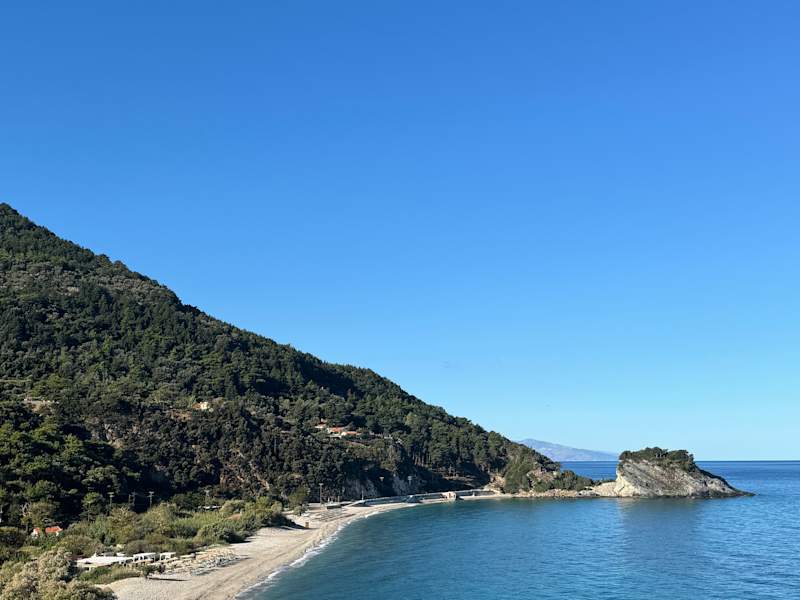 Der Potámi Strand liegt ca. 2-3 km westlich von Karlóvassi in schöner Umgebung. Der Strand ist ein Kiesstrand und es gibt – in bestimmten Abschnitten – Sonnenschirme und Liegen. Allerdings ist nicht der gesamte Strand damit „zugepflastert“. Sehr schön. :-) Kommt man mit dem PKW, so kann man diesen oberhalb des Strandes an der Straße parken. Ab hier geht dann eine Treppe hinunter ans Meer. An der Straße findet man auch ein größeres Restaurant – das „Sunset“. Dort habe ich wirklich gut gegessen. Die Kalamari (keine Ringe!) und die Doraden kosteten je 8 € und schmeckten sehr lecker. Fürs Mythos habe ich 3 € gezahlt. Direkt am Strand befindet sich ein kleiner Imbiss. Hier habe ich leider versäumt, nach den Preisen zu schauen. Der Strand war zur Zeit meines Besuches (Hochsaison - 8. August) absolut nicht überlaufen. Es war dort eher recht ruhig – insbesondere linksseitig. Hat mir sehr gut gefallen.
