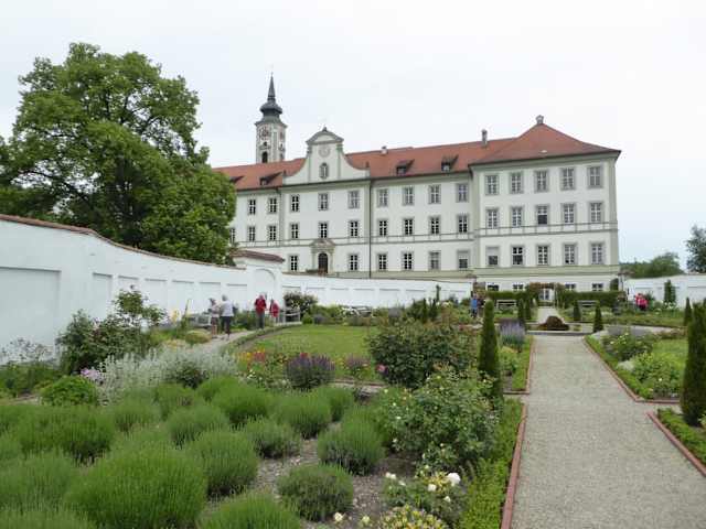 Nach dem Mittagessen im Klosterbräustüberl schauten wir uns noch den Prälatengarten in der gegenüberliegenden Klosteranlage an. Der Prälatengarten diente bis Ende der 90-ger Jahre eher als Nutzgarten. Allerdings war er zum Teil total verwildert, da es den Klosterbrüdern einfach an Zeit fehlte, sich darum zu kümmern. Der 1200 Quadratmeter Garten wurde 1998 von der Interessengemeinschaft „ Schönes Schäftlarn e. V.“ neu angelegt. Wie man in einer Broschüre nachlesen konnte, haben viele Helfer über Hunderte Stunden ehrenamtlich gearbeitet, bis dieser herrliche Garten entstanden ist. Über 80 verschiedene Rosensorten werden neben Lavendel, Buchs, Stauden und Sommerblumen in den Beeten gepflanzt. Zehn Bänke laden die Gäste zum Verweilen und zum Gespräch ein. Der Besuch des Gartens ist kostenlos. Das Zentrum des Gartens bildet der Springbrunnen, der von einer Quelle gespeist wird, die im nahegelegenen Berghang entspringt. Diese Quelle fließt Sommer wie Winter. Vom Brunnenbecken führen vier Hauptwege in alle Himmelsrichtungen. An einer Seitenwand im Prälatengarten kann man ein Lobschreiben von Joseph Kardinal Ratzinger lesen, dem späteren Papst Benedikt XVI. der im Sommer 2002 zusammen mit seinem Bruder und Freunden in Hohenschäftlarn war und sich den Prälatengarten ansah. Gegenüber vom Prälatengarten im Obstgarten befindet sich auch ein großes Bienenhaus. Seit etwa 100 Jahren gibt es schon ein eigenes Bienenhaus in der Klosteranlage, um das sich bisher verschiedene Mönche und ein Mitarbeiter kümmerten. Wie man im Internet nachlesen kann, ist das Bienenhaus des Klosters inzwischen so beliebt geworden, dass eine Zusammenarbeit mit interessierten Kindern und Biologielehrer des Gymnasiums in Form einer "Arbeitsgemeinschaft Bienen" gegründet wurde, zu der sich die Gruppen regelmäßig treffen, um Interesse zu wecken für die faszinierende "Welt der Bienen". Der Besuch des schön angelegten Prälatengartens war sehr aufschlussreich.