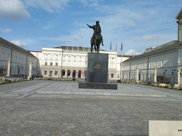 Wenn man auf der Krakowskie Przedmieście, der Krakauer Vorstadt von Süden kommend (von der Ul. Nowy Swiat) in Richtung Norden (zum Königsschloss und Schlossplatz) läuft, so kommt man direkt am Pałac Prezydenck, dem Präsidentenpalast vorbei. Auf der Straße vor dem Palast, der durch eine Kette abgesperrt ist, findet man noch immer Kerzen, Blumen, Kreuze usw., die an den Flugzeugabsturz von Smolensk vom 10. April 2010 erinnern, als der damalige Staatspräsident von Polen, Lech Kaczyński, zusammen mit 95 anderen Menschen ums Leben kam. Auf dem rechten Seitenflügel ist eine Tafel für Lech Kaczyński angebracht. Der Zugang zum Palast / Palasthof wird von zwei Steinlöwen bewacht. In der Mitte des Ehrenhofs ist das Reiterstandbild von Fürst Józef Antoni Poniatowski. Von der Kettenabsperrung aus hat man einen guten Blick auf den Palast, auf den Palasthof / Ehrenhof und auf das Reiterstandbild. Das Gebäude, das seit 1995 der Amtssitz der polnischen Präsidenten ist, stammt aus dem 17. Jahrhundert. In der Folgezeit hatte das Palais eine wechselvolle Geschichte. Im Zweiten Weltkriegs war hier das Zentrum der Deutschen in Warschau und wurde als „Deutsches Haus“ bezeichnet. Es ist eines der wenigen Gebäude im Zentrum von Warschau, das den Krieg relativ unbeschädigt überstanden hat.