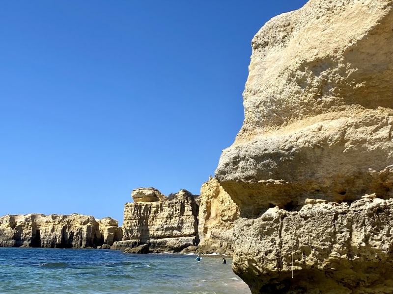 Praia da Coelha, der Hasenstrand (oder Kaninchenstrand) befindet sich in der Nähe vom Hotel Baia Grande (in dem wir für eine Woche Gast waren). Von diesem Hotel aus kommt man nach ca. 700 Meter zur Praia da Coelha. Die kleine Bucht, die links und rechts von den Felsen der Steilküste eingerahmt ist, verfügt über einen schönen Sandstrand. Wenn man am Strand steht und auf den Atlanik schaut, so befindet sich auf der rechten Seite der Bucht eine Höhle, in die, je nach Gezeitenstand, das Meer seine Wellen spült. Wir waren am Abend hier zum Sonnenuntergang – ein tolles Schauspiel, bei dem die Felsen in rot erstrahlten. Am Zugang zum Strand befindet sich ein Strandcafé / Strandrestaurant.